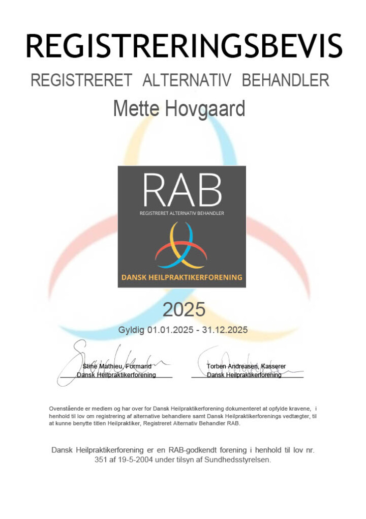 eller støttet af sygesikringen, men til gengæld er vi RAB godkendte. Det vil sige Registreret Alternativ Behandler. Det er en